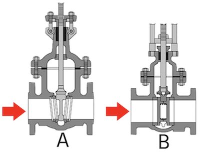 The Gate valves are divided into two main types: Parallel and Wedge-shaped. The parallel gate valves use a flat gate between two parallel seats (refer to drawing B), and for Wedge gate valve the gate is wedge-shaped (refer to drawing A).